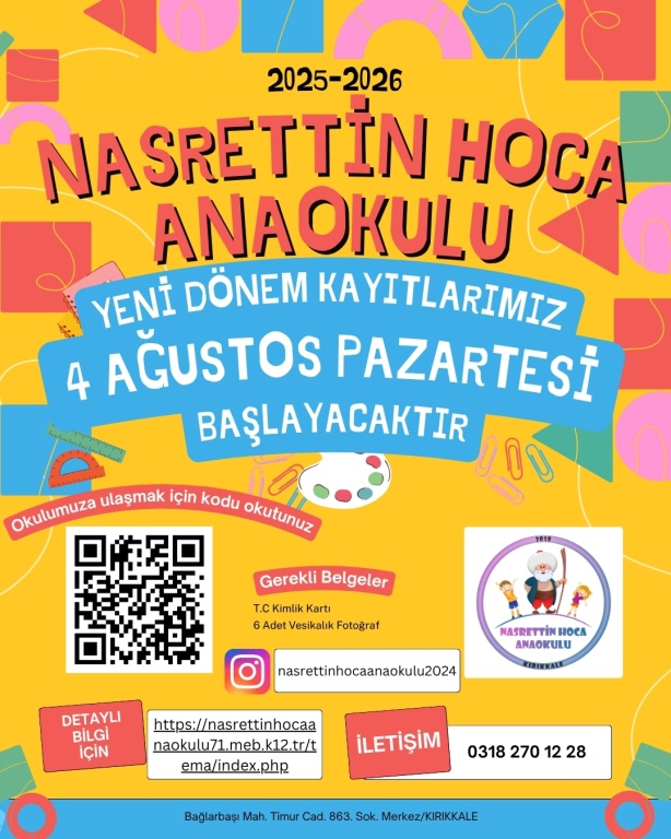 2025-2026 EĞİTİM-ÖĞRETİM YILI YENİ KAYIT DÖNEMİMİZ 04/08/2025 TARİHİNDE BAŞLAYACAKTIR. ÇOCUKLARINI OKULUMUZA KAYIT YAPTIRMAK İSTEYEN TÜM VELİLERİMİZİ BEKLİYORUZ.