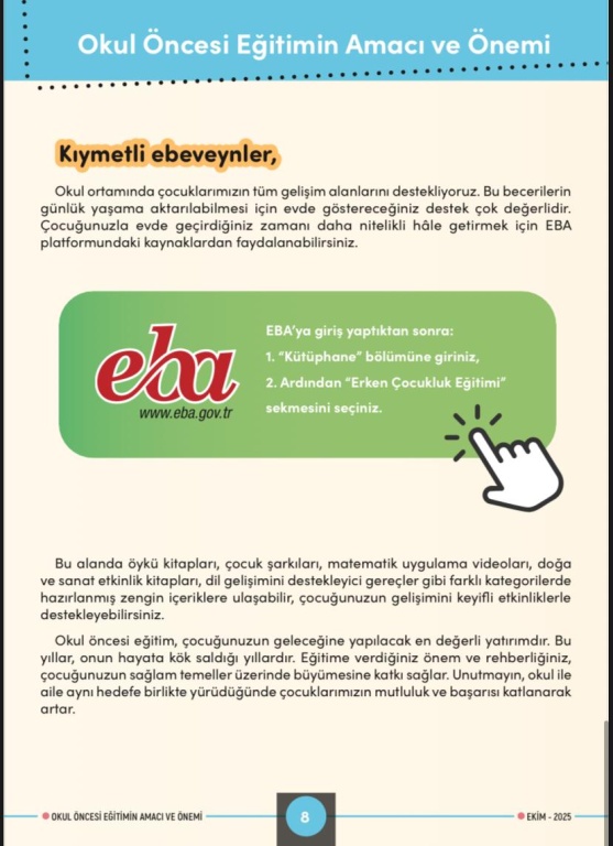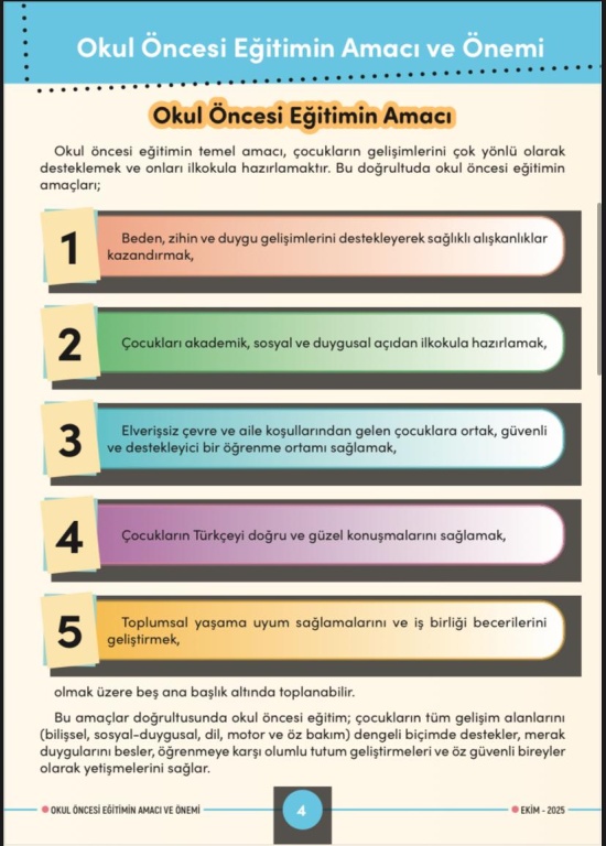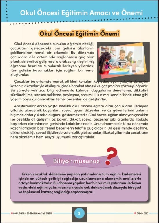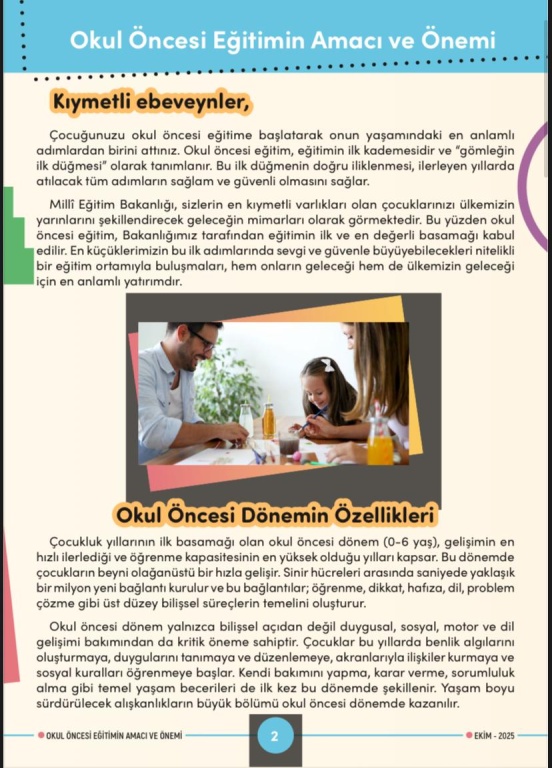 Temel Eğitim Genel Müdürlüğünce, anne babaların bilinçlendirilmesi ve sürece aktif katılımlarının desteklenmesi amacıyla okul öncesi eğitime devam eden çocukları olan ailelere yönelik her ay "Aile Eğitim Bülteni" hazırlanıyor. 2025 yılı Ekim ayı Aile Eğitim Bülteni, "Okul Öncesi Eğitimin Amacı ve Önemi" temasıyla hazırlandı. Bültenin içeriğinde "Okul Öncesi Dönemin Özellikleri, Okul Öncesi Eğitimin Önemi, Okul Öncesi Eğitimin Amacı, Çocuğunuzun Bir Günü Okulda Nasıl Geçer, Okul-Aile İş Birliği Nasıl Sağlanabilir, Okul-Aile İş Birliğinin Çocuğunuza Katkıları" başlıkları yer alıyor.